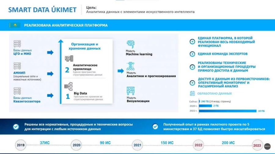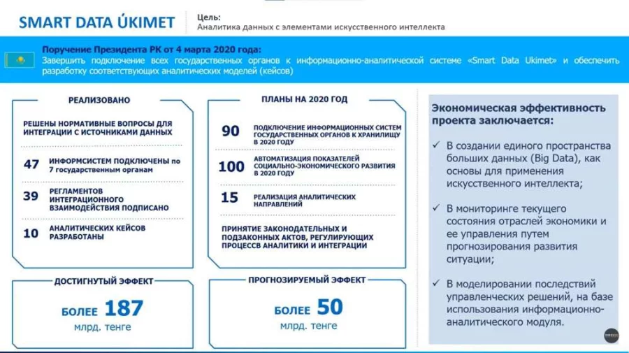 Таким образом, национальным оператором по информационным технологиям была проделана громадная работа по интеграции большинства баз данных государственных информационных систем в единую платформу-хранилище исторических и актуальных защищенных данных и их интеллектуальной обработке и визуализации для конкретных потребностей государственного аппарата Казахстана по принятию точных и выверенных управленческих решений. Заодно сформирована команда опытных дата-инженеров высокой квалификации, которые продолжают развивать и поддерживать созданную интегральную систему, плюс решена проблема с прямым доступом к базам данных госорганов — Smart Data Ukimet собирает их без использования шлюза электронного правительства.