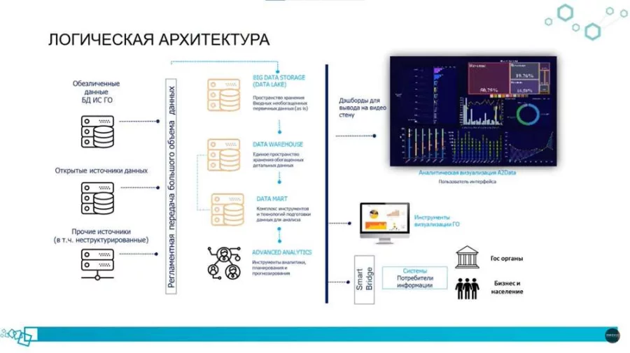 В итоге, что имеем: актуальные данные со всех государственных информационных систем, инструментарий по визуализации полученных данных, а также наличие бесплатного доступа к этому инструментарию у всех государственных органов. Иными словами, госорганы могут бесплатно строить любые аналитические решения на основе точных государственных данных, не внедряя собственные аналитические системы для анализа и визуализации больших данных. Полную техническую поддержку всему проекту оказывает АО «НИТ», который является оператором проекта и уполномоченным органом.